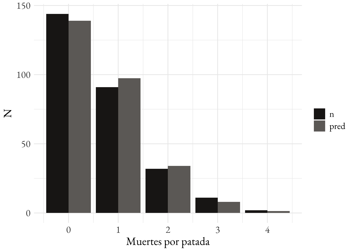 Ladislaus von Bortkeiwicz descubrió que estos datos siguen una distribución Poisson. Esta distribución sirve para modelar eventos raros que suceden en forma independiente con una tasa de ocurrencia (\(\lambda\)) constante.